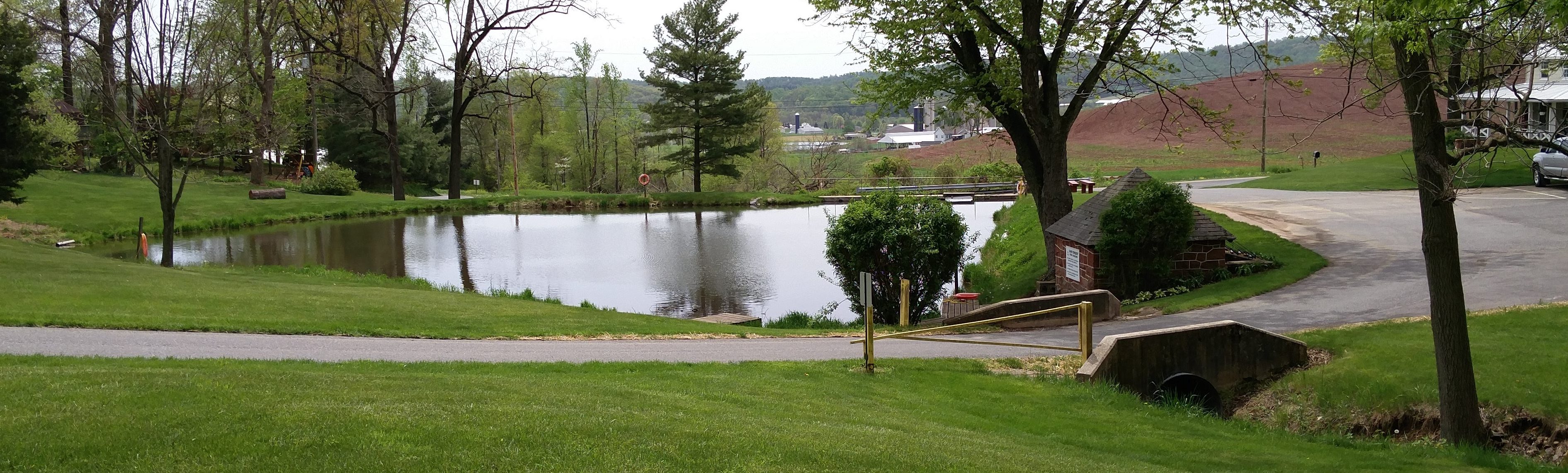 The pond area greets you upon arrival to Camp Conquest. Here you can enjoy fishing for sunfish, paddling on corcls, or exploring the stream.